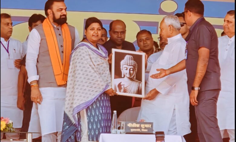 अंजुम आरा ने मुख्यमंत्री नीतीश कुमार का स्वागत भगवान बुद्ध का तैल चित्र भेंट कर किया