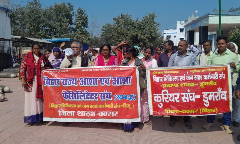 बक्सर। गुरुवार को दस ट्रेड यूनियनों के आह्वान पर गुरुवार को जिले की आशा एवं आशा फैसिलिटेटर कार्यकर्ताओं ने हड़ताल में शामिल होकर सिविल सर्जन कार्यालय के समक्ष आक्रोशपूर्ण प्रदर्शन किया। प्रदर्शन का नेतृत्व आशा एवं आशा फर्स्ट लेटर संघ के राज्य उपाध्यक्ष सह जिला संयोजक अरुण कुमार ओझा, चिकित्सा संघ के राज्य उपाध्यक्ष मनोज चौधरी, महावीर पंडित, मीरा कुमारी एवं डैजी देवी ने किया। प्रदर्शन के बाद आयोजित सभा की अध्यक्षता मीरा कुमारी व डैजी देवी ने तथा संचालन अरुण कुमार ओझा ने किया। वक्ताओं ने कहा कि पिछले छह माह से आशा एवं आशा फैसिलिटेटरों को प्रोत्साहन राशि का भुगतान नहीं हुआ है। साथ ही राज्य स्वास्थ्य समिति द्वारा निर्धारित 57 कार्यों के अतिरिक्त अन्य कार्य भी उनसे कराए जा रहे हैं। मांगों में बकाया प्रोत्साहन राशि का भुगतान, सेवानिवृत्ति आयु 65 वर्ष करने, बढ़ी हुई ₹2000 प्रोत्साहन राशि सीधे खाते में देने तथा तृतीय वर्ग कर्मचारी का दर्जा देने सहित 13 सूत्री मांगें शामिल हैं। मांगपत्र सिविल सर्जन के माध्यम से पटना भेजा गया। 23 फरवरी को पटना में राज्यस्तरीय प्रदर्शन की चेतावनी दी।