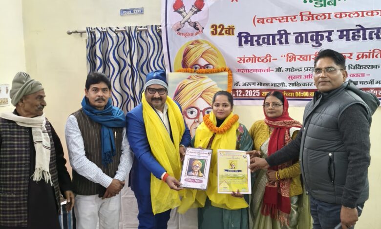बक्सर। डिस्ट्रिक्ट आर्टिस्ट एसोसिएशन ऑफ बक्सर (डाब) के तत्वावधान में स्थानीय रेडक्रॉस भवन के सभागार में भोजपुरी के शेक्सपियर भिखारी ठाकुर की जयंती समारोहपूर्वक मनाई गई। इस अवसर पर “भिखारी ठाकुर क्रांति-दर्शिता” विषयक संगोष्ठी का आयोजन हुआ। कार्यक्रम का उद्घाटन प्रख्यात चिकित्सक-साहित्यकार डॉ. महेंद्र प्रसाद एवं प्रख्यात साहित्यकार डॉ. अरुण मोहन भारवि ने भिखारी ठाकुर के तैलचित्र पर माल्यार्पण व दीप प्रज्ज्वलन कर संयुक्त रूप से किया। इसके उपरांत 56 प्रकार के भोग अर्पित कर तथा देसी केक काटकर उन्हें श्रद्धांजलि दी गई। कार्यक्रम की अध्यक्षता एवं संचालन डाब के अध्यक्ष व वरिष्ठ रंगकर्मी सुरेश संगम ने किया, जबकि धन्यवाद ज्ञापन रेडक्रॉस सचिव डॉ. श्रवण कुमार तिवारी ने किया। मुख्य अतिथि डॉ. अरुण मोहन भारवि रहे। विशिष्ट अतिथियों में सत्यदेव प्रसाद, सुरेश अग्रवाल, बृजकिशोर सिंह एवं डॉ. शशांक शेखर शामिल थे। इस अवसर पर पत्रकार मनोज सिंह, राम एकबाल ठाकुर, अजय कुमार मिश्रा, गिरधारी अग्रवाल, रागिनी जायसवाल, प्रदीप जायसवाल एवं ओमजी यादव को मोमेंटो, पगड़ी व प्रमाण पत्र देकर सम्मानित किया गया। कार्यक्रम संयोजक गोपाल राय सहित बड़ी संख्या में कलाकार व साहित्यकार उपस्थित रहे।