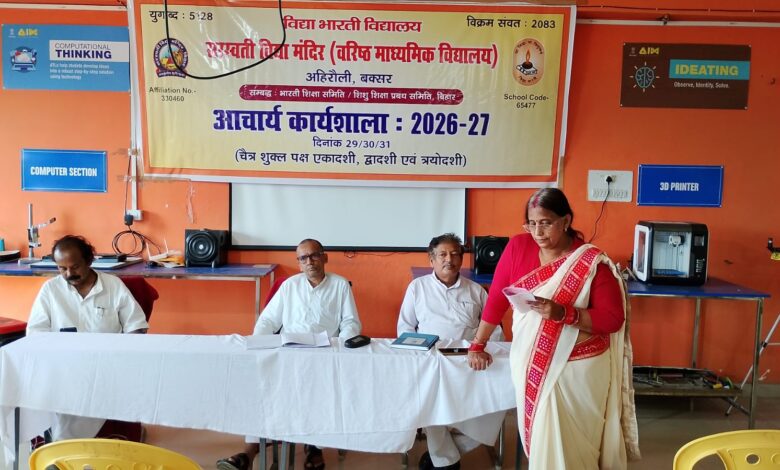 बक्सर। सरस्वती विद्या मंदिर, अहिरौली में सत्र 2026-27 के लिए तीन दिवसीय आचार्य कार्यशाला का शुभारंभ रविवार को हुआ। 29 से 31 मार्च तक चलने वाली इस कार्यशाला के प्रथम दिन कार्यक्रम की शुरुआत मां सरस्वती की वंदना के साथ की गई। विद्यालय के प्राचार्य मनोरंजन कुमार ने कार्यशाला के उद्देश्यों पर विस्तार से प्रकाश डालते हुए कहा कि शिक्षण को प्रभावी और छात्र-केंद्रित बनाना इस कार्यशाला का मुख्य लक्ष्य है। उन्होंने आचार्यों को समयबद्ध, अनुशासित और गुणवत्तापूर्ण शिक्षा देने के लिए प्रेरित किया। भोजपुर विभाग के विभाग प्रमुख लाल बाबू प्रसाद ने प्रेरक कथाओं के माध्यम से आचार्यों को उनके कर्तव्यों और दायित्वों का स्मरण कराया। उन्होंने कहा कि स्वाध्याय के बाद सुनियोजित पाठ-योजना के साथ कक्षा में प्रवेश करना और छात्रों को संतुष्ट करना एक शिक्षक की प्राथमिक जिम्मेदारी है। द्वितीय सत्र में गणित विषय की अध्यापन पद्धति पर विशेष व्याख्यान दिया गया, जिसमें शिक्षकों को सरल एवं प्रभावी तरीके से पढ़ाने के गुर सिखाए गए, ताकि छात्र विषय को आसानी से समझ सकें।